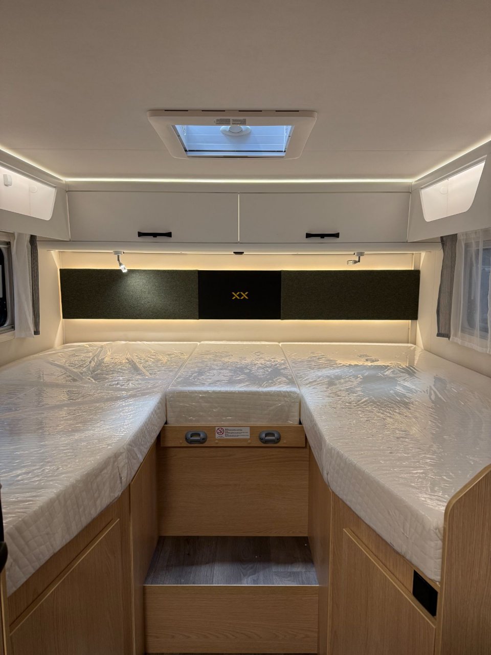 Unser Wohnmobil verfügt über zwei Einzelbetten im Heck, die sich bei Bedarf zu einer großen Liegefläche verbinden lassen, sowie über ein praktisches Hubbett über der Sitzgruppe.